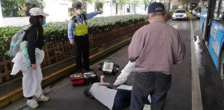 温旭东见状,立即联系指挥中心通知120急救,并安排辅警滕李彬到公交车后指挥交通,此时因为公交车的停靠,导致后续排队的车辆渐渐增多,为了避免车道堵塞,温旭东一路小跑到公交车后面,向后方车辆解释情况,并引导车辆换道进行临检和疏导。