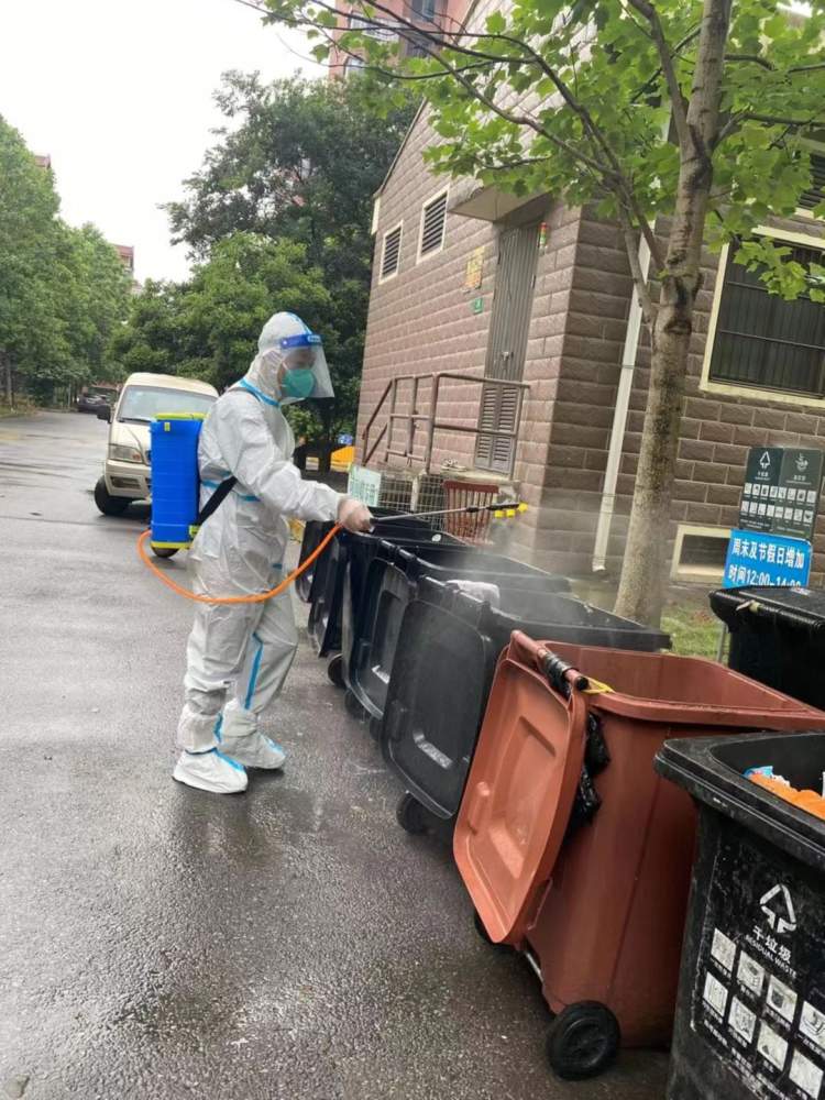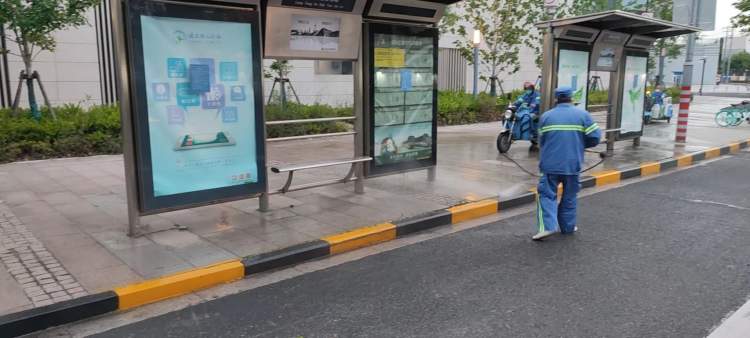 在徐汇区馨逸公寓,环卫保洁人员对小区周边地面道路及路面附属设施开展冲洗,并对公厕等环卫设施进行清洁、维护洗手设施。同时,物业服务人员对小区道路路面、水景、地下车库、垃圾厢房、快递货架、门禁或电梯按钮等公共部位进行预防性消毒。病媒生物防制专业人员在小区设置或维护捕蝇笼、毒鼠盒等四害防制设施,做好小区地下积水空间蚊幼控制,在地下车库、楼栋或绿地开展成蚊密度控制。城管执法人员则发放预防性消毒主体责任工作说明卡,指导、督促沿街商户做好门责管理、预防性消毒,应用“场所码”等。