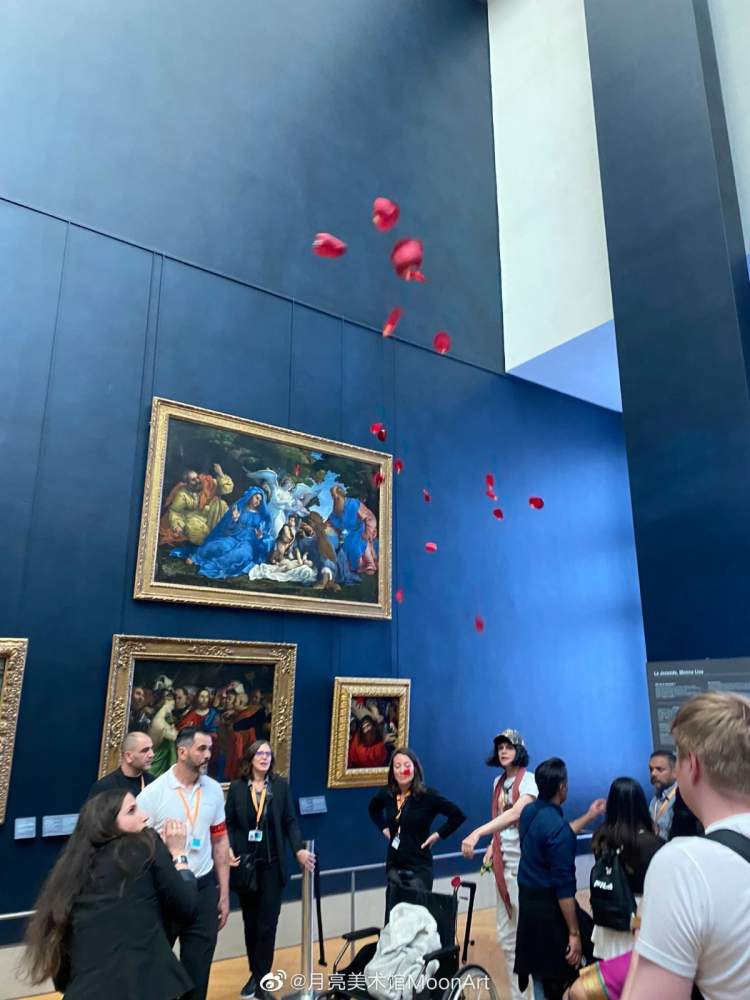 向《蒙娜丽莎》扔蛋糕并在周围洒下玫瑰花瓣的男子