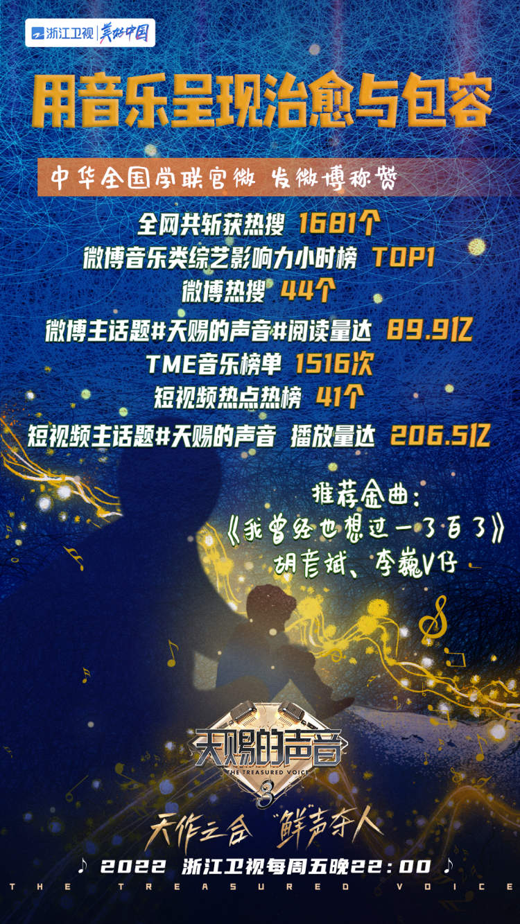 节目中,张韶涵、胡海泉、刘惜君、谢可寅、白小白、张紫宁、杨默依、王弦、陈雨琪组成的原唱队,与胡彦斌、张碧晨、张赫宣、赖美云、李巍V仔、裘德、李大奔组成的改编队进行了新一轮的两两对决。 节目播出后,多个节目话题登上各大平台热搜榜。截至目前,节目全平台累计热搜超1681个,#天赐的声音#阅读量已突破89.9亿,短视频平台#天赐的声音#播放量破206.5亿。