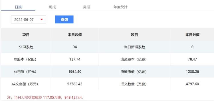 截至6月7日,北交所上市公司94家,总市值1964亿元,当天成交金额5.36亿元。