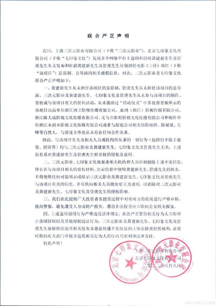 如今上海三次元影业、北京七印象文化联合发布声明,辟谣黄建新、管虎二人参与该项目一说。