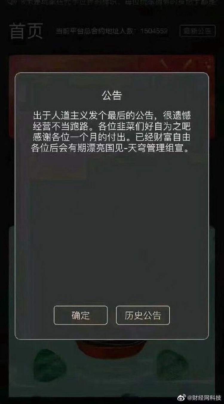 近日,一张关于天穹元宇宙数字藏品平台跑路的公告截图在网上流传。截图显示,该平台因经营不善跑路,并将用户称为韭菜。