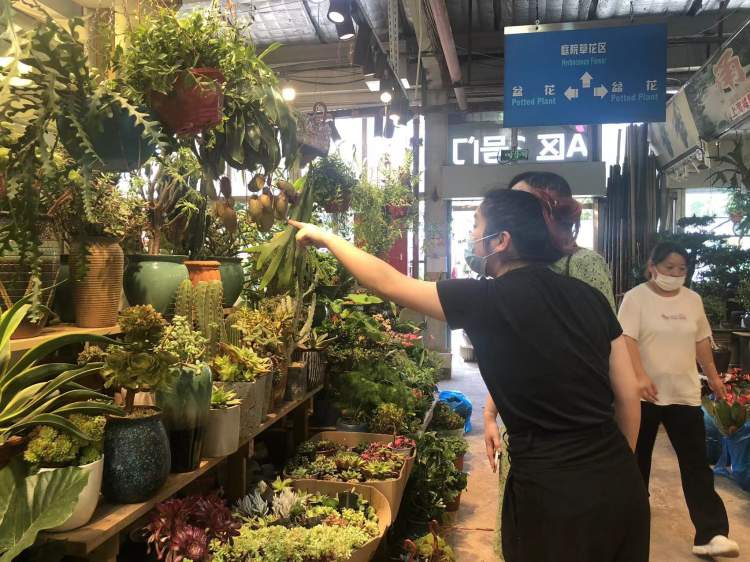 重新开业后的花市里,三角梅、舞春花、绣球、玫瑰、百合、蝴蝶兰、荷花、茉莉花、栀子花、多肉……草花、鲜切花、盆花等各类花卉五彩缤纷,生机盎然,透着初夏的生命力。