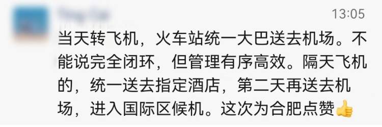 若仅当天在合肥转机,则如上图网友所述,在高铁站会有专人引导,将旅客集中用大巴送往机场,无需隔离,接近闭环概念。如果旅客需要在合肥经停一晚次日离开,还会统一安排酒店住宿。