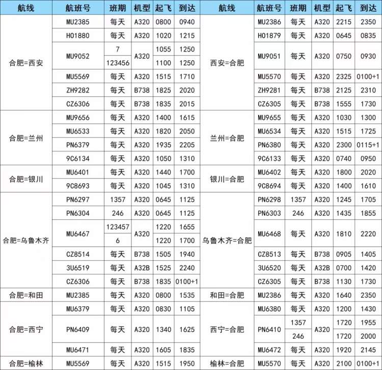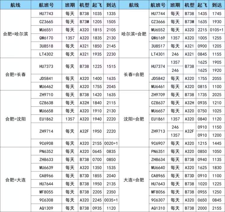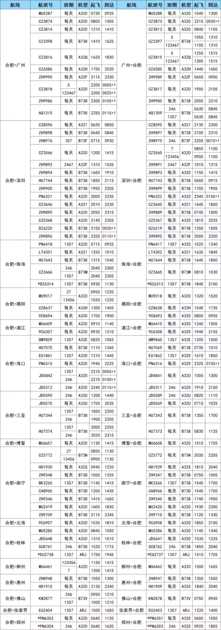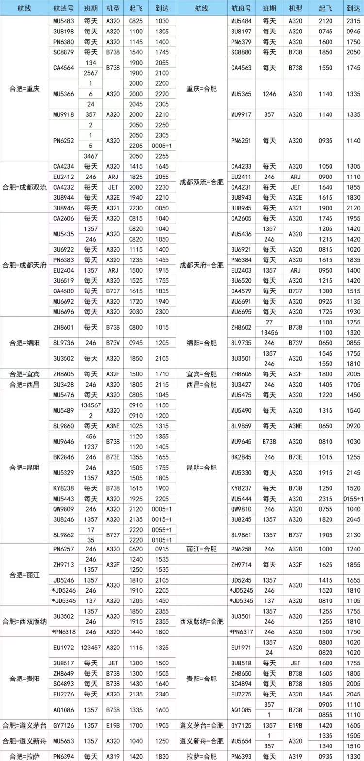 今年3月下旬合肥新桥国际机场就曾发布过夏季航班时刻表,以华北、华东、中南、西北、西南、东北划分,可供有需求的旅客参考: