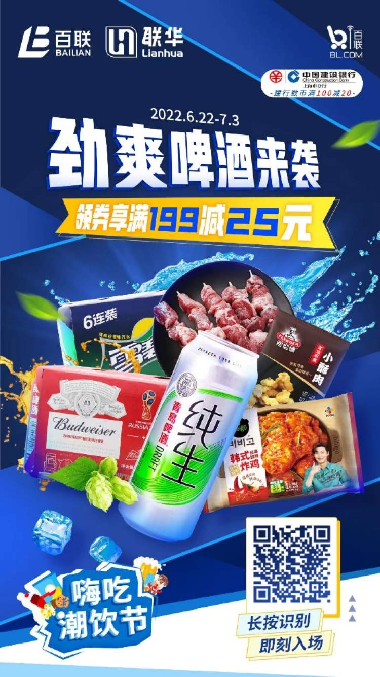 除了联华超市及世纪联华各线下门店,此次嗨吃潮饮节,消费者即使足不出户,在i百联联华云超、线上百联到家平台都能同步参与以上活动,无论你身处何地,都能下单购得好物。值得一提的是,30分钟送到的百联到家、云超B2C平台与线下门店同步开始打造“啤酒+小食”的消费场景,让消费者更有感知。线上平台更是以组合方式进行推荐:12罐500ml青岛啤酒经典装售价78元,580克的百草味卤味大礼包69元,让经典老青岛搭配香浓卤味;2罐1升青岛13度原浆啤酒售价72元,2袋香辣味王小虎虎皮凤爪仅58元,原浆啤酒和个儿大肉多的网红凤爪,让人接连吃不停;12罐500ml青岛纯生啤酒仅需86元,加上500克百草味热辣鸭脖大礼包59元,145元就可以享受冰爽啤酒和热辣鸭脖带来的味蕾冲击。6月24日 —— 6月26日,在百联到家平台消费指定品类,还能满118元立减18元,更有周周优惠可享。