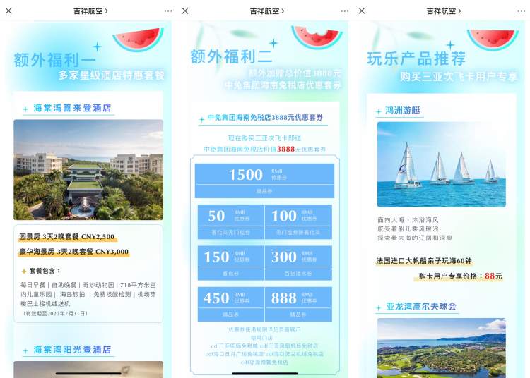 去海边度假始终是暑期里的热门出游选项。昨晚,吉祥航空就推出了上海=三亚、海口=上海两条航线的飞行产品“海岛次飞卡”,即可以选择其中一条航线往返飞行一次,适用航班日期为今年的7月1日至31日,销售和兑换日期为即日起至7月27日。