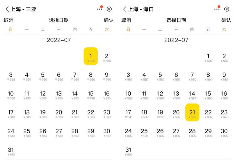 记者查询了7月的上海至海口和三亚两地的机票价格,上旬的不少航班单程票价基本维持在六七百元,下旬起票价有所上涨,单程最低价格也都超过800元,多数航班价格均超过千元。