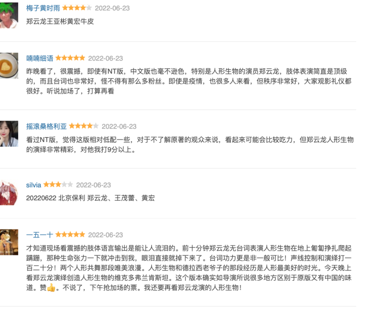 总体感觉就是震撼!非常精彩!就像导演说的,郑云龙演的人形生物很“灵动”!出场那段没有台词挣扎着想站立起来的肢体表演,全靠动作和神情,非常难,但他呈现的就很好,看得出来他是想象力非常丰富的那种,艺术家!全程演技在线,情感到位,节奏把握的特别好!台词水平也很高!中间有一段和女人形生物共舞,也特别让人震撼,非常美!
