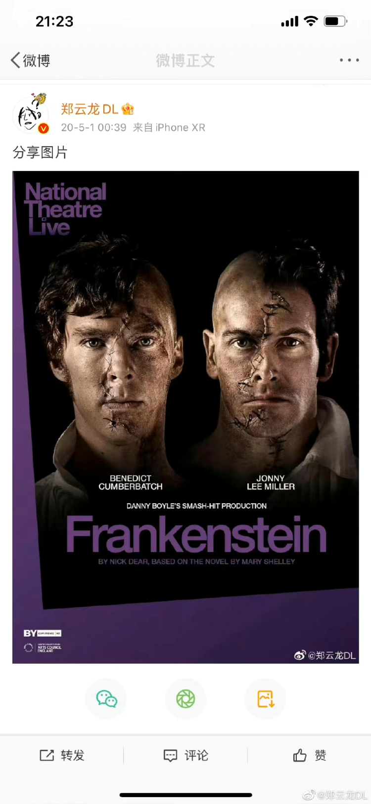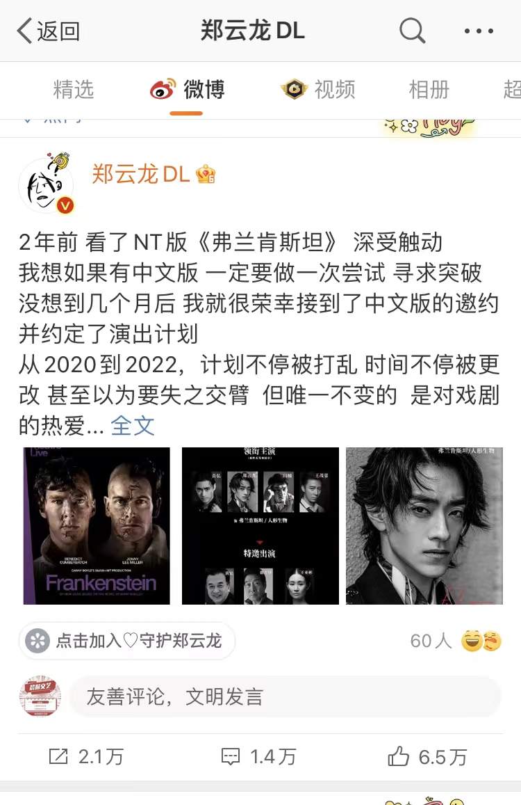 才知道现场看震撼的肢体语言输出是能让人流泪的。前十分钟郑云龙无台词表演人形生物在地上匍匐挣扎爬起蹒跚,那种生命张力一下就冲击到我,眼泪直接就掉下来了。台词功力更是非一般可比!声线控制和演绎打一百二十分!两个人形共舞那段唯美浪漫。人形生物和德拉西老爷子的那段经历是人形最美好的时光。今天晚上看郑云龙演绎创造人形生物的维克多弗兰肯斯坦。这个版本确实如导演所说很多地方区别于原版又有中国的味道。赞👍。不说了,下午抢加场的票。我还要再看郑云龙演的人形生物!