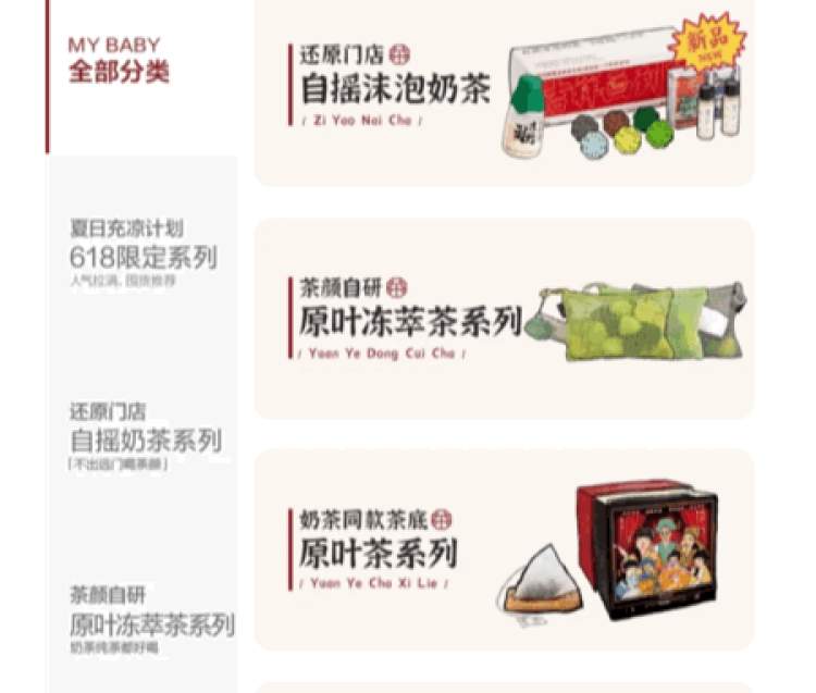 他们家主要分为自摇奶茶系列、原叶冻萃茶系列和原叶茶系列,每个系列里又有不同的小分支,以原叶茶系列为例,其中又包括果香、花香、纯茶、混搭四类。