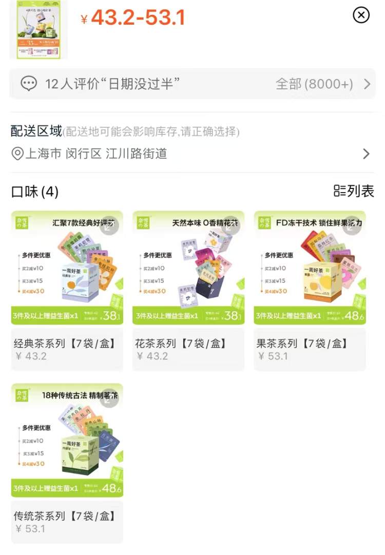 果茶比较特别的是添加了冻干果片,而且冰糖包是独立的,能根据自己的口味调整。不过价格也高一些,目前是53.1元1盒,平均7.5元每袋。经典茶和花茶系列会便宜一丢丢,也要43.2元,平均6.1元。