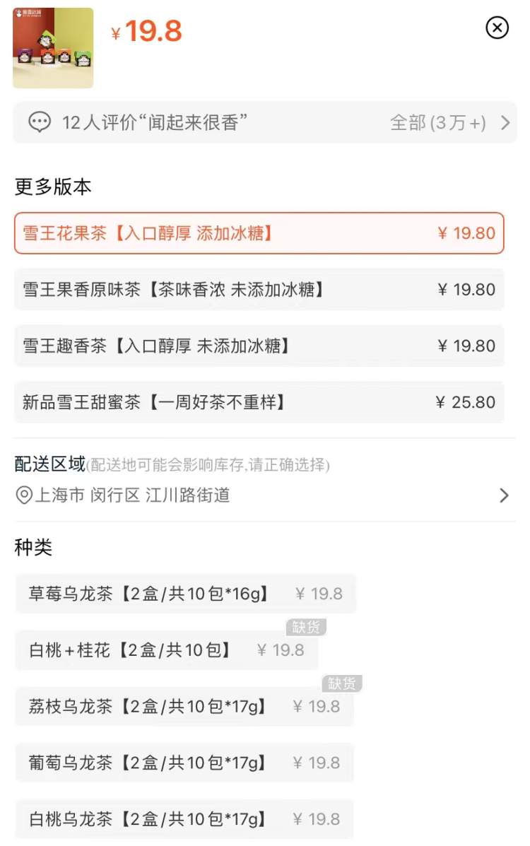 雪王花果茶的口味包括草莓乌龙、白桃桂花、葡萄乌龙、蜜瓜乌龙等,基本上涵盖了现在比较流行的口味,目前价格19.8元2盒共10包,差不多2元一包。