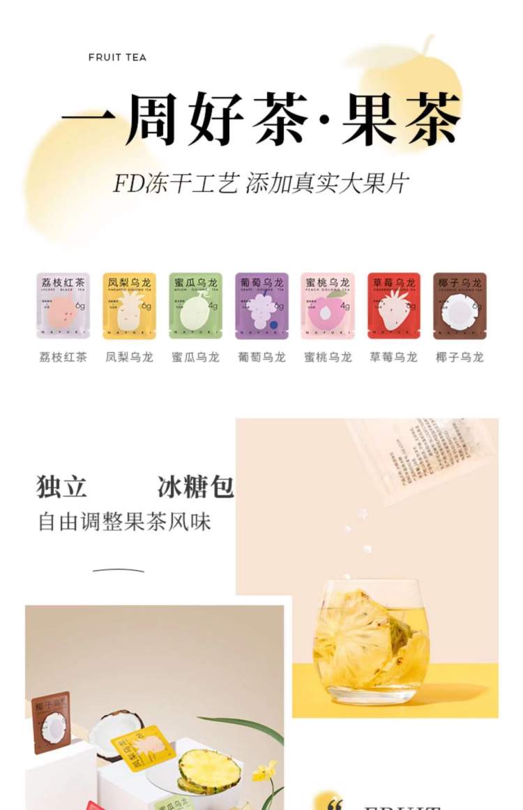 奈雪の茶线上的产品种类很多,致力于把传统茶玩出新花样,而且名字很美,比如奈雪初露、月光美人、栀白染夏……主打的产品就是“一周好茶”,同样是7袋一盒,可以选择花茶、果茶、经典茶等不同口味。