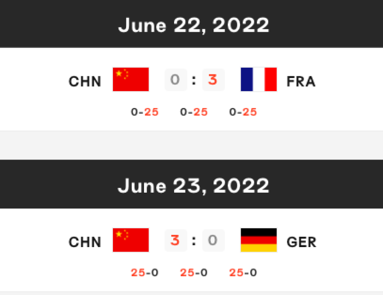 6月23日,原定于当地时间下午3点举行的中国男排对阵德国男排的比赛,因德国队主动退赛,中国队自动获胜,国际排联在官网发布的三局比分结果全部为25:0。