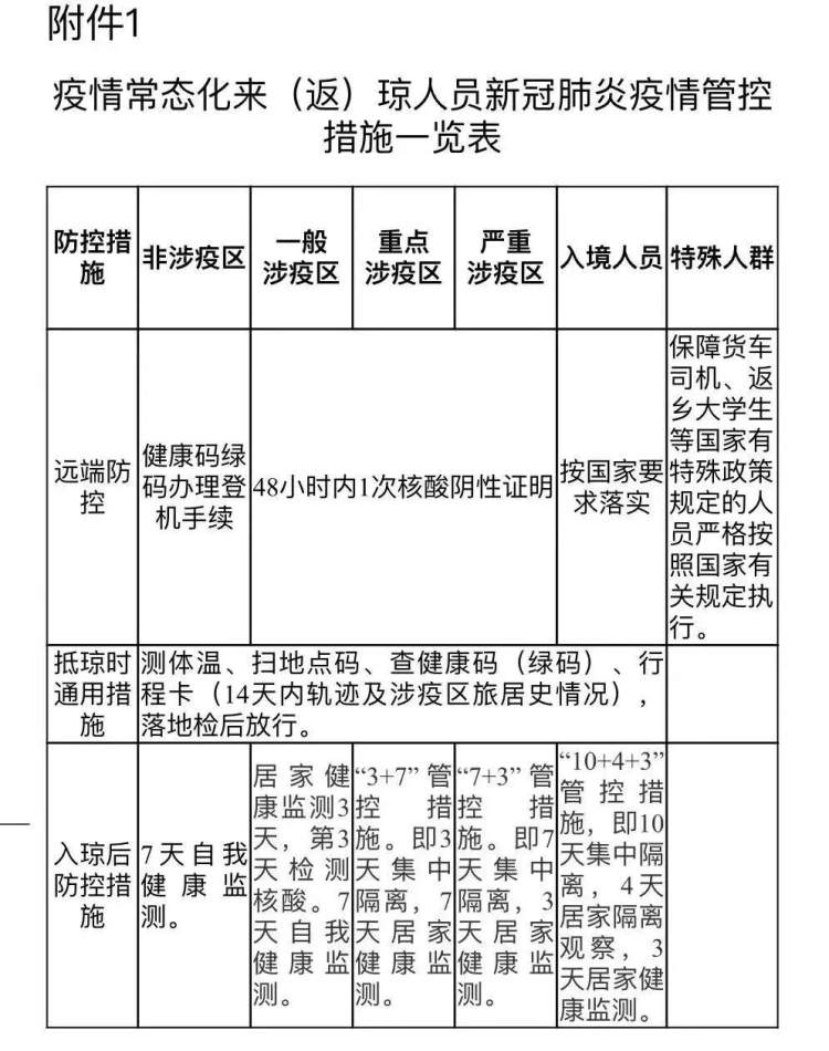 6月19日,海南再次调整防疫措施,对非涉疫区人员(14天内无涉疫区旅居史),凭健康码绿码办理登机,不强制要求核酸阴性证明。抵琼时测体温、扫地点码、查健康码(绿码)、行程卡,落地检测核酸后放行;入琼后开展7天自我健康监测。
