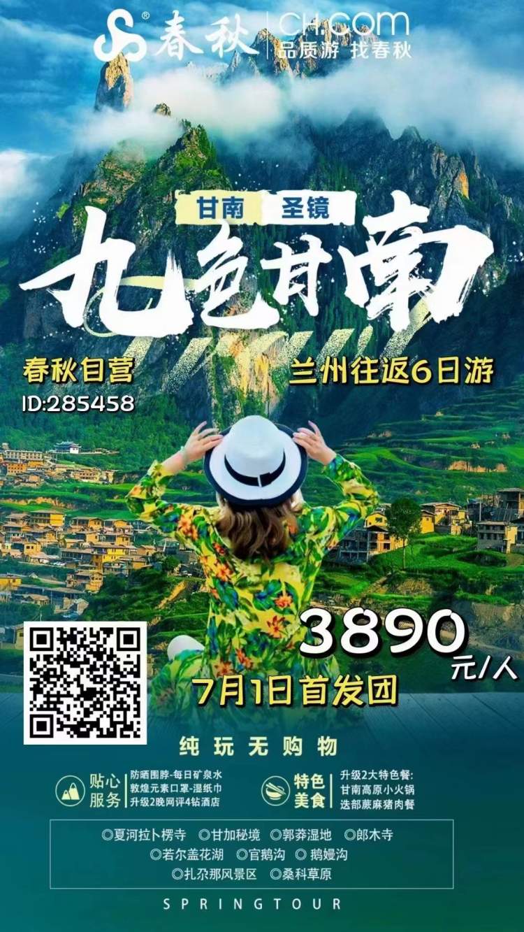 春秋集团今日宣布,将于7月1日发起“兰州往返6日游”首发旅行团,途经甘加秘境、拉卜楞寺、桑科草原、郭莽湿地、郎木寺、扎尕那、官鹅沟、鹅漫沟等景点,人均价格为3890元,往返航班为春秋航空承运。