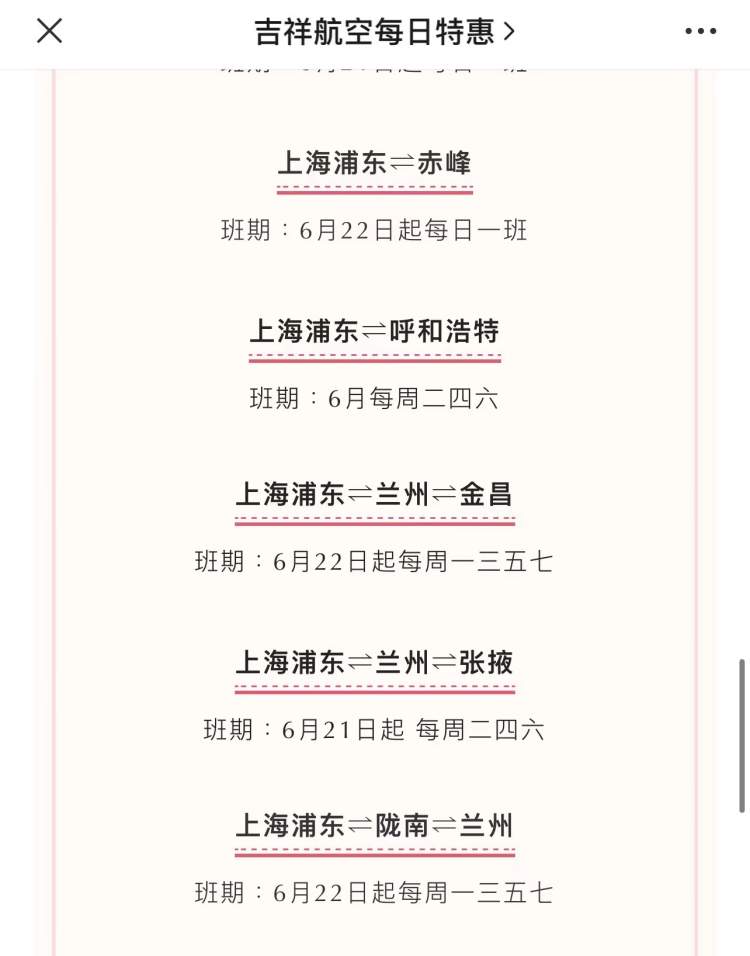 吉祥航空近期每周二四六执飞一班上海浦东至兰州的HO1103次航班,每周一三五七执飞两班上海浦东至兰州的HO1101和HO1041次航班。