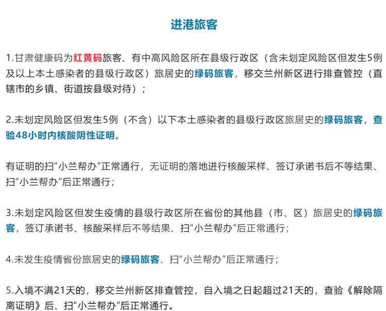 甘肃早在6月初就提出取消对低风险区游客限制。目前兰州中川机场方面的规定是,有中高风险区所在街道旅居史的旅客,落地后会进行集中排查管控,但低风险地区(所在区、街道无疫情)旅客落地只需要进行核酸采样,签署承诺书后即可离开,采样费用为每人4元一次。