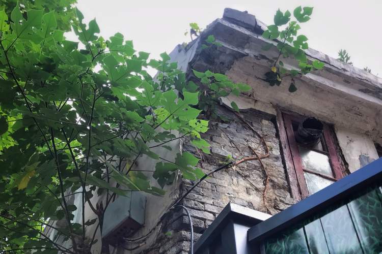 6月21日上午,天气晴朗,阳光从江宁路上梧桐树宽大的叶子里漏下来,在街边映出耀眼的光斑。68岁的顾家尧(化名)举着沉重的照相机,半蹲在泰来坊白底黑字的门楼下,一丝不苟地拍照。在他的上方,一条粗壮的树根将墙角拱起,在墙头顽强地长成了一棵树。在他的身边,垃圾清运车正将一车车破烂的建筑垃圾从院子里运出来。