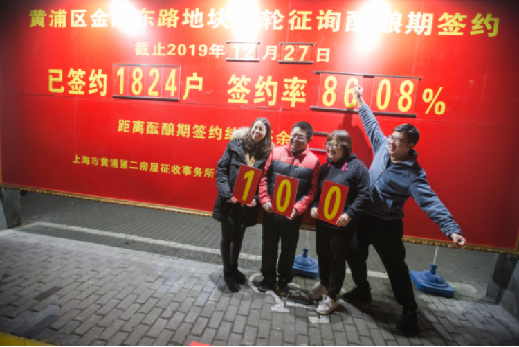 在不到半年时间里,金陵东路地块旧改项目接连创造了黄浦区旧改居民参与度、大体量旧改项目一轮征询赞成率、二轮征询首日签约率、二轮征询居民签约速度、搬迁率等“五个第一”的纪录,最终实现了大规模地块的“零强迁”。