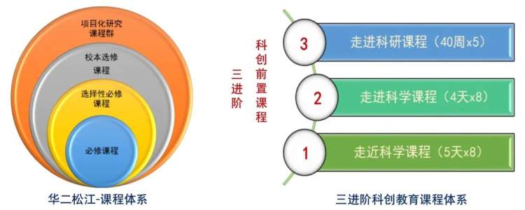 华二松江课程包括国家必修课程、国家课程选择性必修部分、校本选修课程和项目化研究科创课程群四部分。