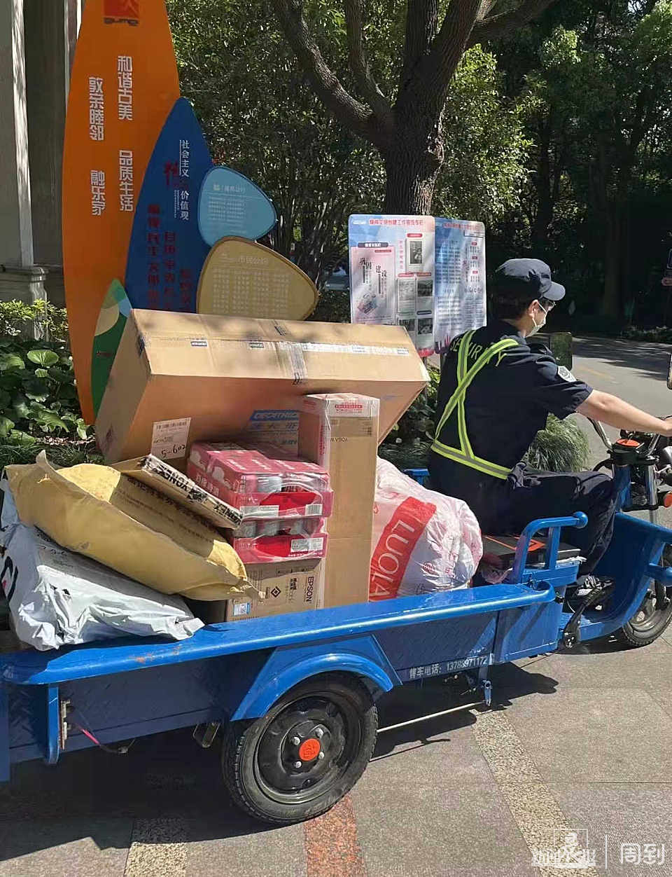 虽然超过40人的物业团队无人缺岗,可金汇豪庭毕竟是一个有着500多户居民的小区,事务繁杂,每天一千到两千件的物资分发任务,都落到了16个年轻的安保人员头上。