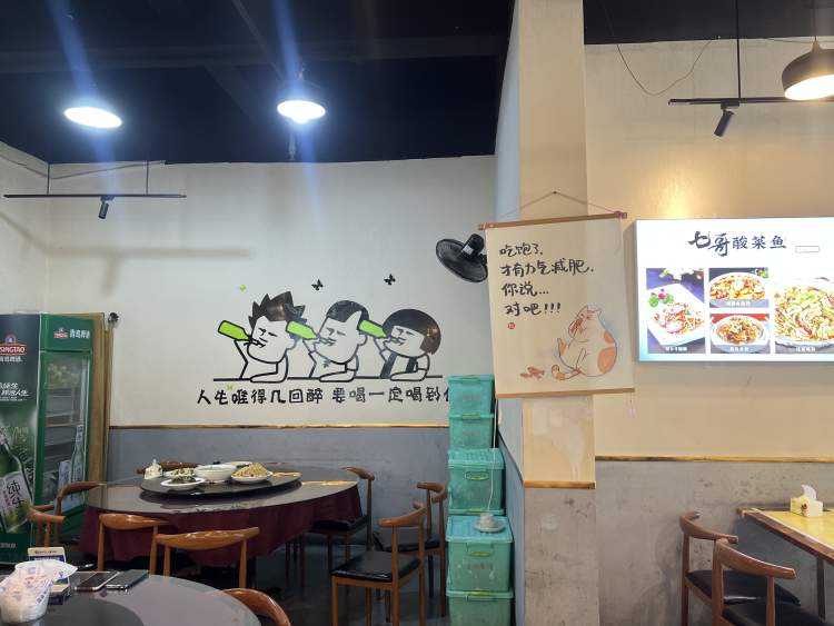 店里的招牌菜酸菜鱼分两种价格,草鱼是39元一份,黑鱼59元。“这种价格,农民工和外卖员都吃得起,都喜欢来。”