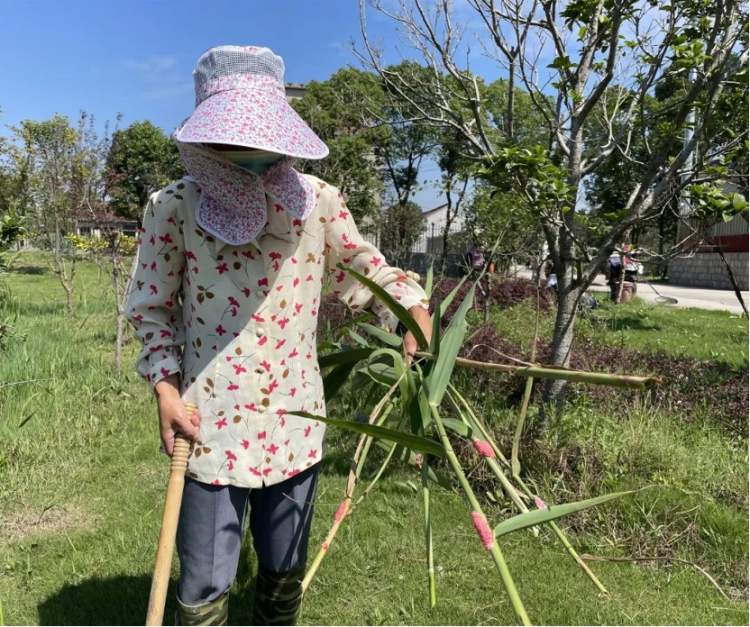 崇明聚训村,河道保洁员清除福寿螺卵块。