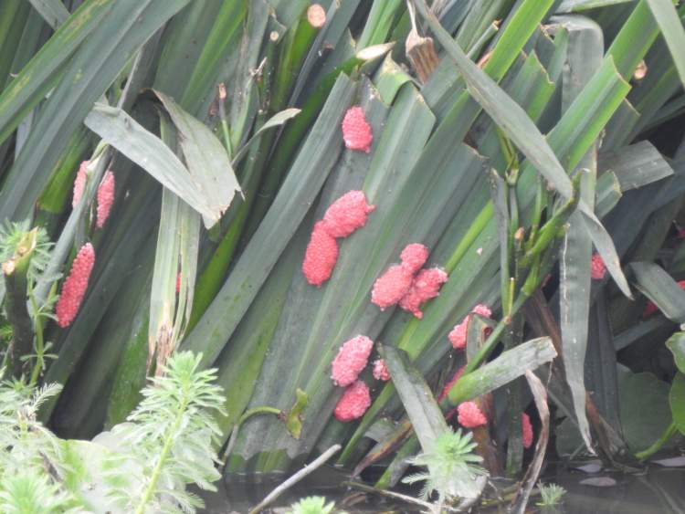 在崇明城桥镇聚训村一条河道,仔细看会发现,岸边芦苇上攀附着一串串桑葚般大小的粉色物体,“这些就是福寿螺产下的卵。”河道保洁员说着,便将这些卵块铲除,然后收集到一起。沿着河岸一路走,会发现河岸边、芦苇上有不少福寿螺卵块。