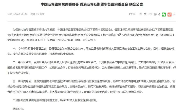 6月28日,中国证监会、香港证监会联合公告,批准两地交易所正式将符合条件的交易型开放式基金(ETF)纳入内地与香港股票市场交易互联互通机制。互联互通下的ETF交易将2022年7月4日开始。目前相关业务规则、操作方案及监管安排均已确定,技术系统已准备就绪。