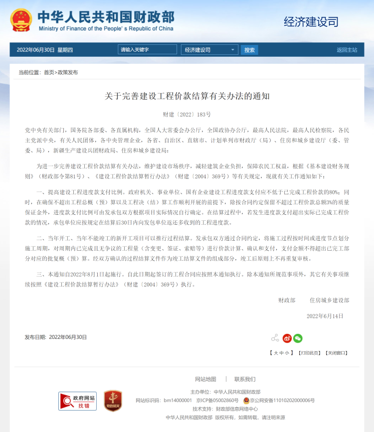 6月30日,财政部和住建部联合发布《关于完善建设工程价款结算有关办法的通知》。