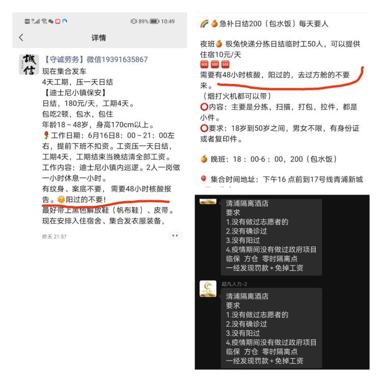 当记者再一次确认,是否招工单位明确向其指出阳过的人不要时,我们得到了十分肯定的回答,“对,要是要的话我们也想送。”这名员工告诉我们,“说实话,阳过的人现在也不少。就算没阳过,在方舱上过班的也不要。没办法,人家都不要,你送去也没用。”