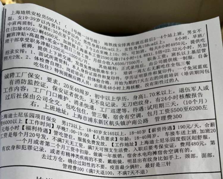 6月15日,背着双肩包,拉着行李箱的陈峰,走在浦东新区周浦镇的一个公交车站旁,看到路旁有人摆着招工广告的易拉宝,招工的人上下打量了陈峰一番,便问陈峰,“你是不是要找工作?”陈峰答,“可以啊,你们这里是什么工作?”对方随即又问道:“兄弟,你有没有在方舱里待过?之前阳过没有?”陈峰想起之前在网上看到的很多招聘广告里特别提到的这一条,害怕告诉对方自己曾经阳过就没有后续了,便试探性地回了句,“没有啊。”没想到对方熟练地说道,“那你打开手机里的随申办,我看看你近两个月的核酸检测记录怎么样。”听罢,陈峰无奈地摇了摇头,离开了公交车站。