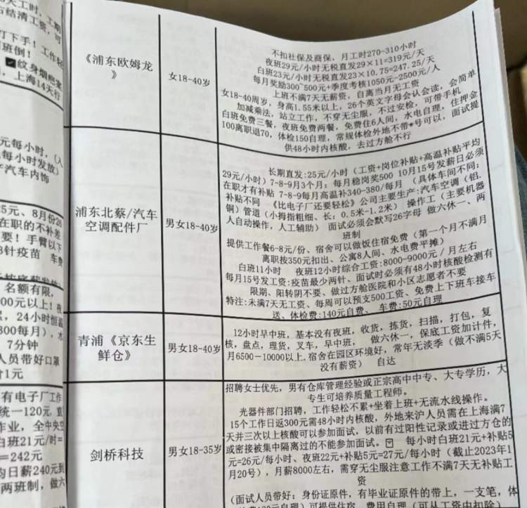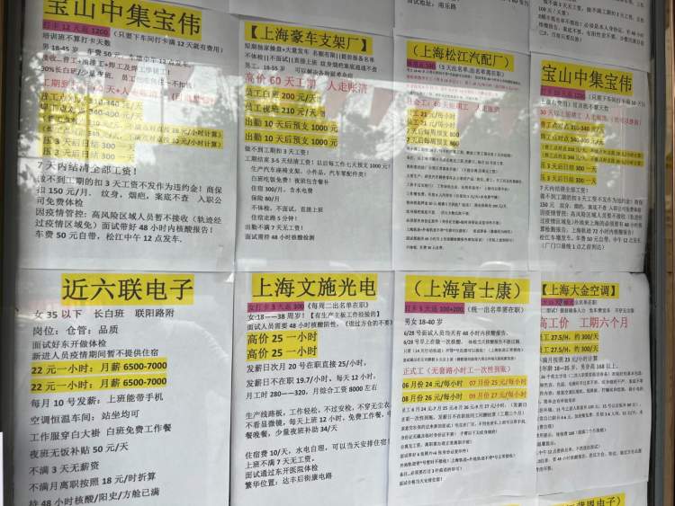 在上海他同样想求得一份电子厂的工作。在他看来,这份工作至少工资还可以,很多还包食宿,但令他没想到的是,他看到兼职群里富士康等企业在招聘启事里明确写道:阳过的不要、进过方舱的也不要。这让他再一次叹气,不知怎么办。