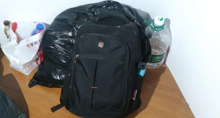 眼下,陈峰只能暂时露宿在临港的公园里,晚上就睡在公园的椅子上,害怕蚊子咬得睡不着,他买了蚊香。他将行李放置在公园另一处“隐秘的角落”, 一大桶水、一个大书包装得鼓鼓囊囊、一个大黑色垃圾袋里面装满衣服杂物,所有东西堆在角落里,用雨布盖着藏好。