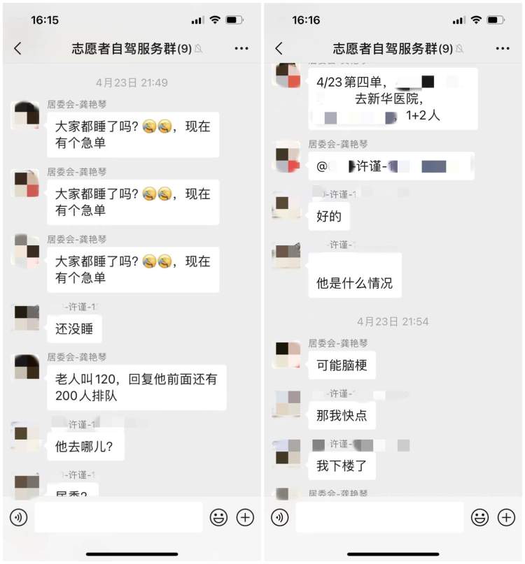 4月23日21:49,有居民打来电话求助,家中老人疑似脑梗需要紧急就医,拨打120被告知已经加急处理,但因资源有限,无法及时调派人手,可能还需要等待一段时间。龚艳琴立即将外出就医用车需求发至群内,许瑾看到信息后立即穿好衣服,做好防护措施后以最快速度将老人送往附近的新华医院,万幸的是送医及时,老人并无大碍。“这样的特殊情况发生过好几次,但我们都在第一时间出车,没有出现一例意外。”许瑾说。