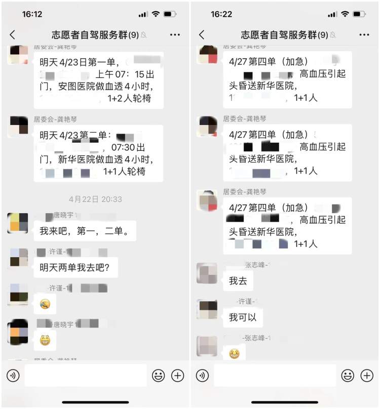 每天晚上,这个有9个人的微信群里就出现这样的派单任务,龚艳琴打趣道:“我像是滴滴平台的总调度,专门负责接单派单。”居民有外出就医需求时,可以通过微信或者电话报备居委会,告知就医时间、地点等信息,龚艳琴会将信息整合汇总发布至“志愿者自驾服务群”内,志愿者们就可以根据自己的时间安排进行接单。如遇到紧急的情况,龚艳琴也会将信息标记“加急”字样或者直接拨打志愿者电话,第一时间将患者送往医院。