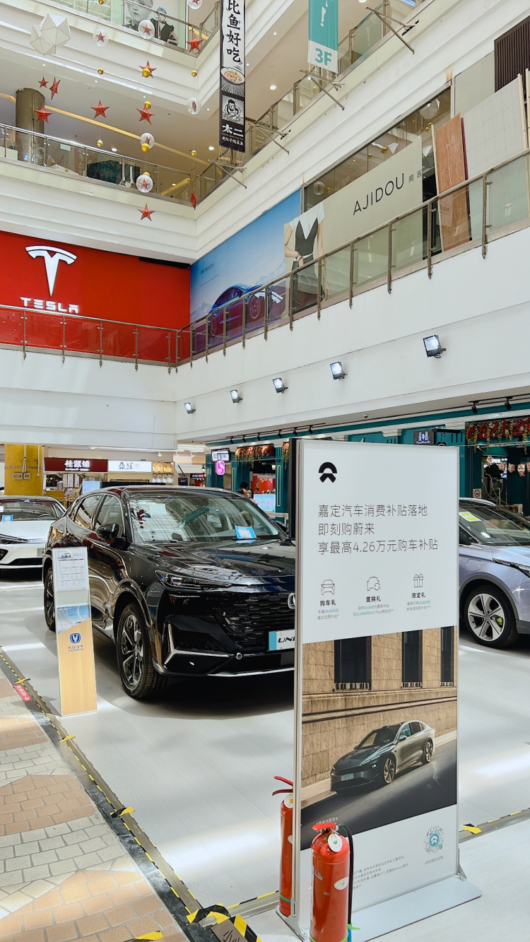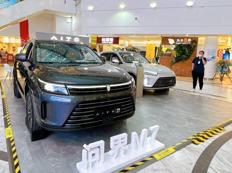 百联世博源则在4区L1层专辟了一个总面积为2500平方米的新能源汽车馆,目前入驻的品牌有上汽R、广汽埃安、比亚迪、极狐、小鹏等。7月4日,AITO问界M7豪华智慧大型电动SUV在商场3区B层中岛揭幕,相关快闪活动将持续至9月底。