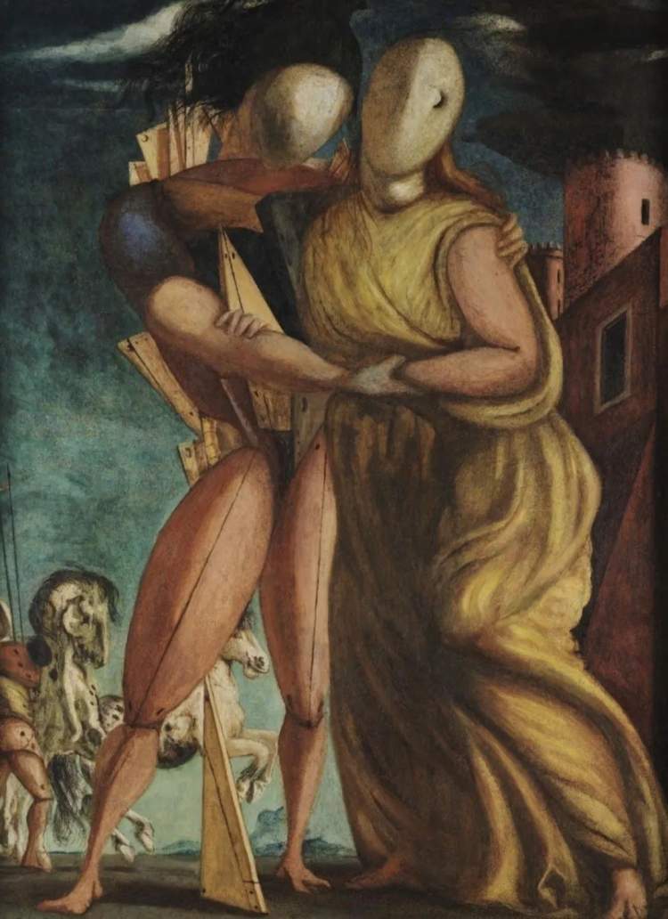 乔治·德·基里柯是意大利形而上画派的创始人之一,并被认为是超现实主义的先驱。他的作品中经常出现空无一人的建筑、无脸模特以及长长的日光影子,注重对艺术内在情绪与象征精神的强调。《赫克托耳与安德洛玛刻》描述了在特洛伊战争背景下,男主人公奔赴战场前跟妻子道别的场景。艺术家将故事中两位主角塑造成了呆板的人体模型,从而留给观众想象的空间。