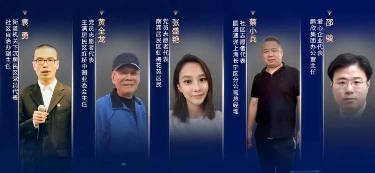 他们中有街道机关下沉居民区的党员干部代表袁勇,在疫情期间,他连续转战多个居民区,甚至还兼任了一段时间的“临时”党总支书记;有虹桥中园业委会主任黄全龙,作为“红色业委会”大家长的他,也是2021年全国“最美家庭”的获得者之一,疫情期间全家总动员,奋战在社区防疫中;有虹梅花苑小区党员志愿者张盛艳,作为两个孩子的母亲,她身先士卒、以身作则,践行党员的初心使命,并发挥自己的兴趣和特长,将小区战疫经历记录下来,剪辑出视频分享给所有的志愿者“战友”;有圆通速递蔡小兵,作为街道新就业群体代表,他在战疫期间的事迹引起了央媒等众多媒体的关注,而他本人也于6月30日成为了一名光荣的中共预备党员;还有鹏欣集团办公室主任邵骏,疫情期间鹏欣集团不仅积极解决社区群众的“物资”难题,还捐款捐物,展现了上市公司的社会担当,同时程家桥街道也为鹏欣集团“雪中送炭”,提供了必要的帮扶,上演了街道与企业互帮互助的友好一幕。