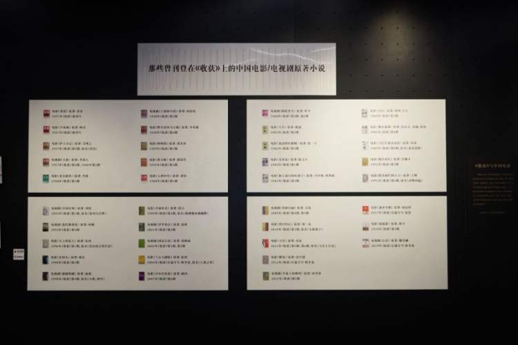 展览的第三个别具特色的板块是——“《收获》与中国电影”,一张巨幅海报和一张原著索引图,拼起了《收获》对中国电影的贡献 ,《茶馆》《日出》《野火春风斗古城》《大红灯笼高高挂》《美食家》《人到中年》《阳光灿烂的日子》《繁花》……