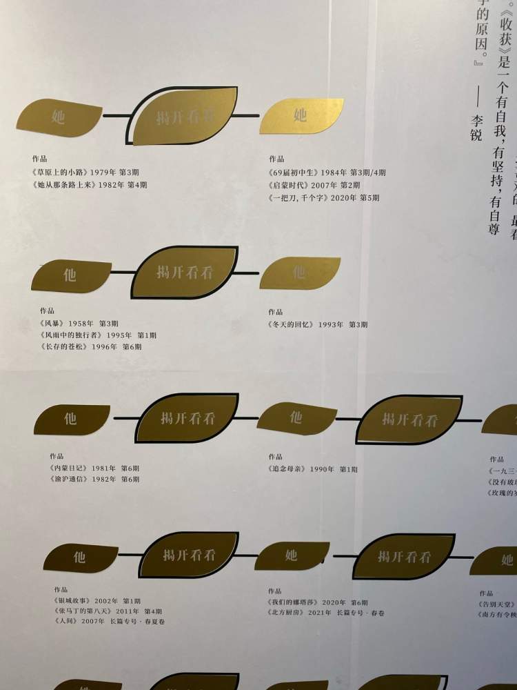 这样的情况在《收获》杂志却并不少见,展览为此设置了一个有趣的读者互动板块,读者可以在“《收获》与文学世家”中,先通过作品,猜一猜作家们的名字;然后再猜猜他们和她们之间是什么关系。
