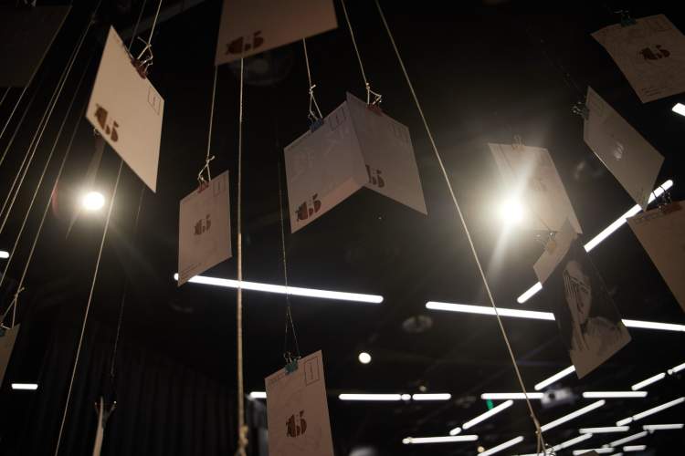 此外,展览现场还有一面巨大的作家签名墙,那一个个熟悉的名字见证了《收获》对中国文学的贡献;还有一张张风格各异的作品插图和杂志封面组成的明信片风铃串,感兴趣的读者们可以在这两处“打卡点”合影留念。