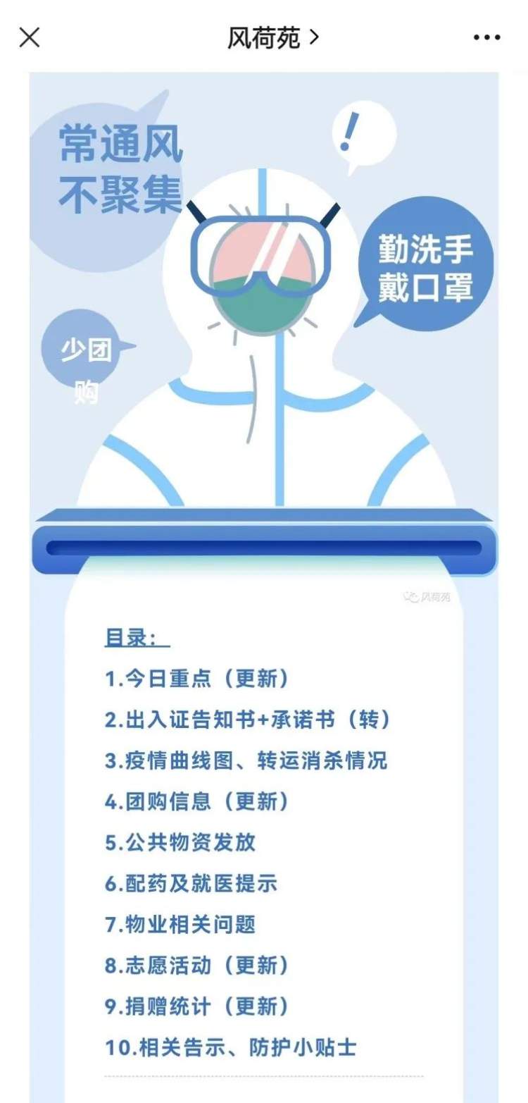 风荷苑抗疫日报涵盖十个方面的内容,团购信息和公共物资发放让多次投诉的居民得到满意的答案;华师大一村防疫简报中居民以漫画“白甲战士”展现志愿者风采;紫御豪庭抗疫日报,及时发布疫情动态,也让居民共同参与监督……