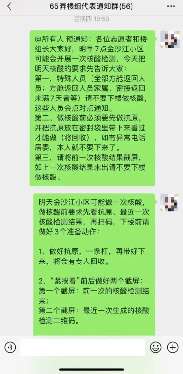 特别是,在抗原筛查过程中,从居民告知、检测培训,到志愿者快速招募、任务分配,再到检测结果汇总统计后的安全反馈,都通过楼组微信群得以实现。