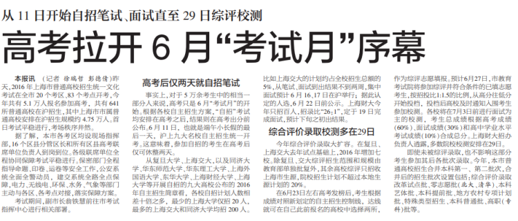 2016年上海高考结束之后,从6月11日开始自招笔试、面试 《解放日报》2016年6月8日第5版