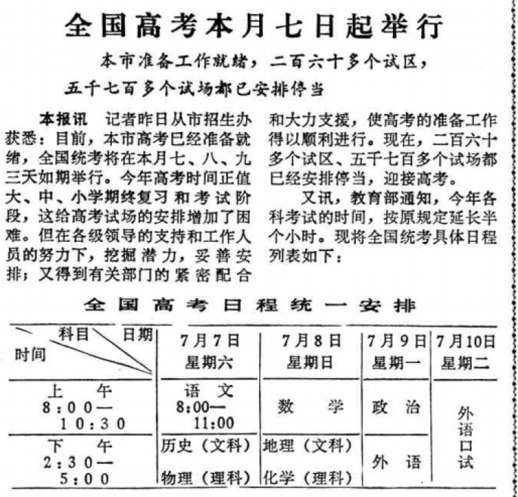 1979年全国高考于7月7日起举行(附表格) 《解放日报》1979年7月4日第2版