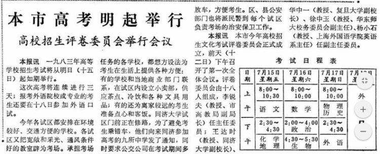 1983年上海高考于7月15日起举行(附表格) 《解放日报》1983年7月14日头版